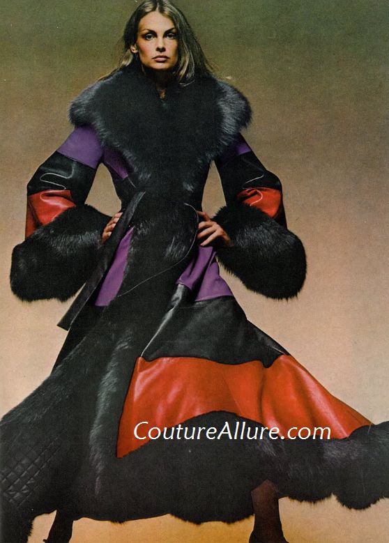 Another incredible coat, this one by Christian Dior, Fall/Winter 1971. Stripes of black, red, and purple leather are accented with black fox fur. The make-up was done by Serge Lutens. Remember him?